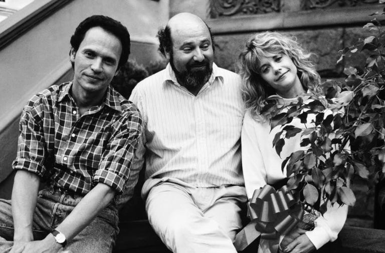 This is really fun!! Re: Harry’s neuroses, those were Rob Reiner’s (as well as his Castle Rock co-producer Andy Sheinman). Andy was a perpetual bachelor and casually sexist (he didn’t think women were funny until he met Nora). But Rob had a strong mother and loved women. He just couldn’t figure out to have a relationship after his divorce from Penny Marshall. Rob was also depressed but very funny about it. Nora said he loved being depressed. She interviewed him like the journalist that she was and based Harry Burns on Rob. The movie was initially going to end with Harry and Sally parting ways — however, Rob met Michele Singer (his future wife) on the set in NYC and changed the ending to a happy one. If Rob hadn’t met Michele, I’m not sure the movie would endure as it has. In the ‘80s, a lot of couples were divorcing — I think audiences really connected with Harry’s post-Helen despair. WHMS gave people hope, like all the great romcoms do. But it stands apart because of its unabashed sadness. A lot of romcoms these days are afraid to be sad. But Reiner was very in touch with his emotions and generous in sharing them. He was/is such a gift to cinema.